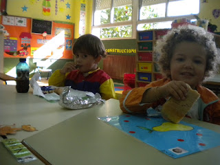 Fixemos uns manteis individuais!! A profe dounos un froita que pintamos coas pegadas dos nosos dedos, logo recortounola (pois era un pouco complicado para recortar nós), pegámola cada un nun folio de cores e decorámolo con gomets. Os máis pequenos puxémoslle a foto xunto ao nome para recoñecelo. Logo a profe plastificounos e así de chulis quedaron!
