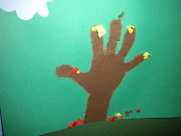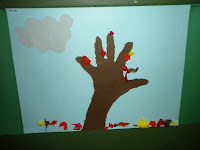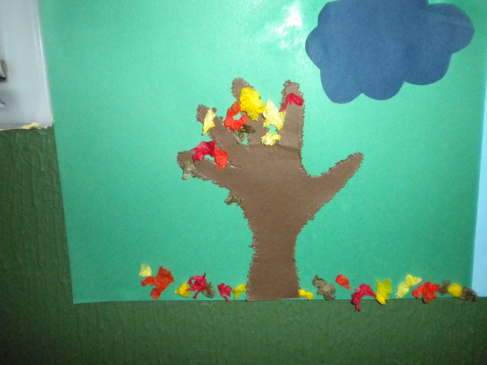 Fai xa días (cando as características desta estación se fixeron máis "palpables") fixemos unha actividade que aínda non vos ensinaramos, aínda que dende aquela decora a nosa clase. Sacamos a idea dun blogue amigo e empregando as nosas mans fixemos a silueta dunha arboriña do Outono, logo fixemos as poucas folliñas que quedaban con boliñas de papel de seda, colocamos un nubarrón cargadiño de choiva e así nos quedaron estes traballiños!!!