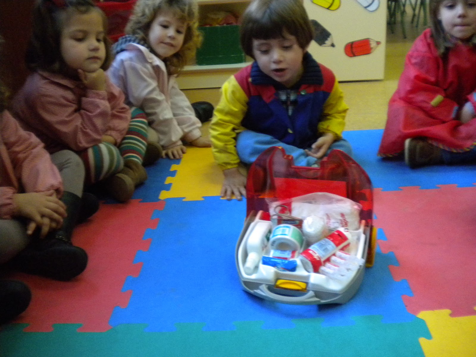 Seguimos traballando no proxecto do corpo e por suposto, relacionándoo cos coidados e enfermidades deste. Onte falamos dos accidentes e das situacións perigosas e hoxe das consecuencias destes. Por iso a profe nos ensinou un botiquín, xa sabíamos moitas cousas del pois temos un de xoguete no recanto do xogo simbólico, pero hoxe ensinounos un de verdade!!