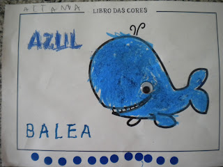 Esta vez tratábase dunha balea, coloreámola con ceras blandas, botámoslle cola con purpurina azul e puxémoslle un olliño, ademais de repasar as súas letras, pegar gomets azuis....