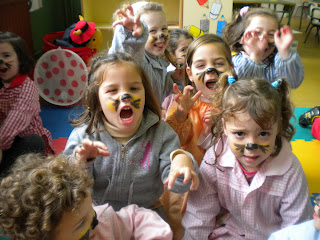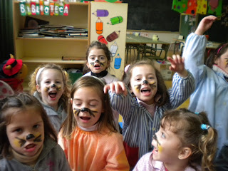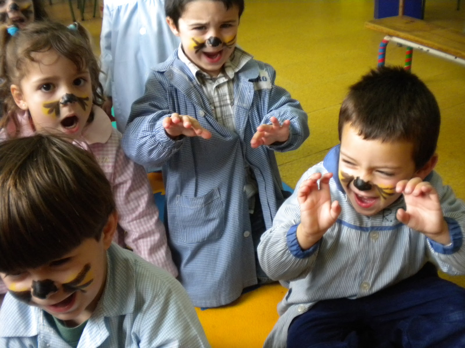 Hoxe no cole estivemos investigando no recanto do circo os animais que hai nel, xa o comentamos varias veces e sabemos que hai cabalos, elefantes, tigres, focas, cans...a profe propúxonos convertirnos en leóns por un intre..