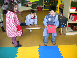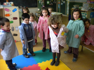 A semana pasada a profe trouxo un dado un pouquiño máis grande do normal...e con el xogamos a un novo xogo: O dado mandón. Temos unha listaxe na clase e dependendo do número que saia teremos que facer unha cousa ou outra: andar como ananiños, como xigantes, saltar a pata coxa...