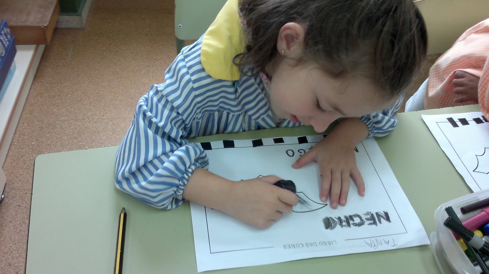 Onte fixemos outra páxina do Libro das Cores e esta vez tocoulle á cor...NEGRA!! E para pintar o morcego desta actividade empregamos carbón! Tivemos que facela con moito coidado para non romper a folla e non manchala moito!!